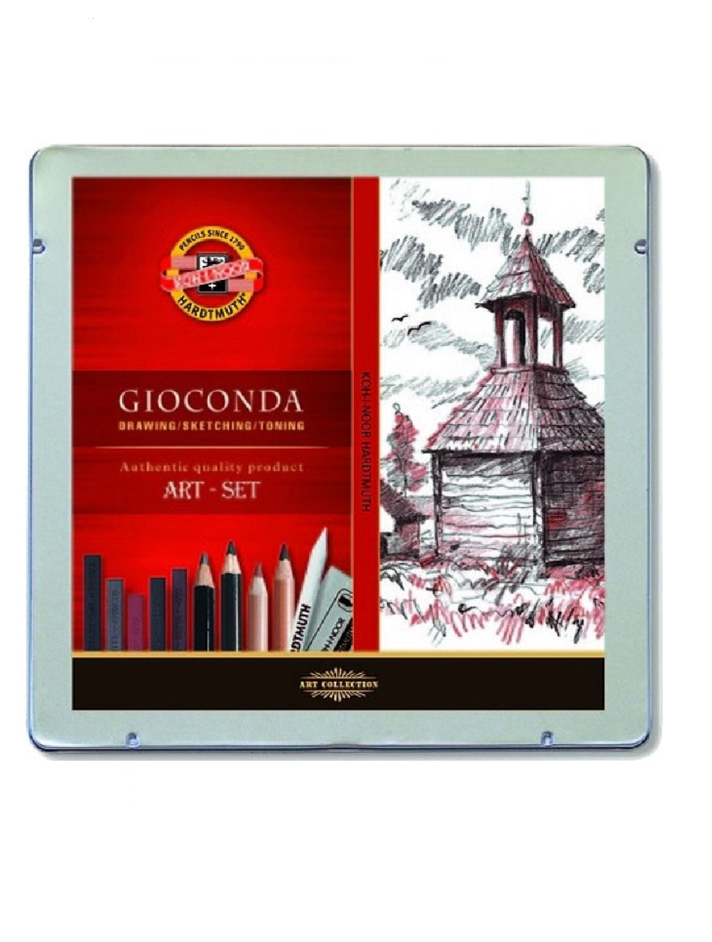 Kreslířská kazetaKoh-i-noor 8899 Gioconda v plechovém obalu obsahuje 24 kusů různých uměleckých tužeky, tuh, uhlů, kříd, grafitových bloků, roztírátko a pryž: